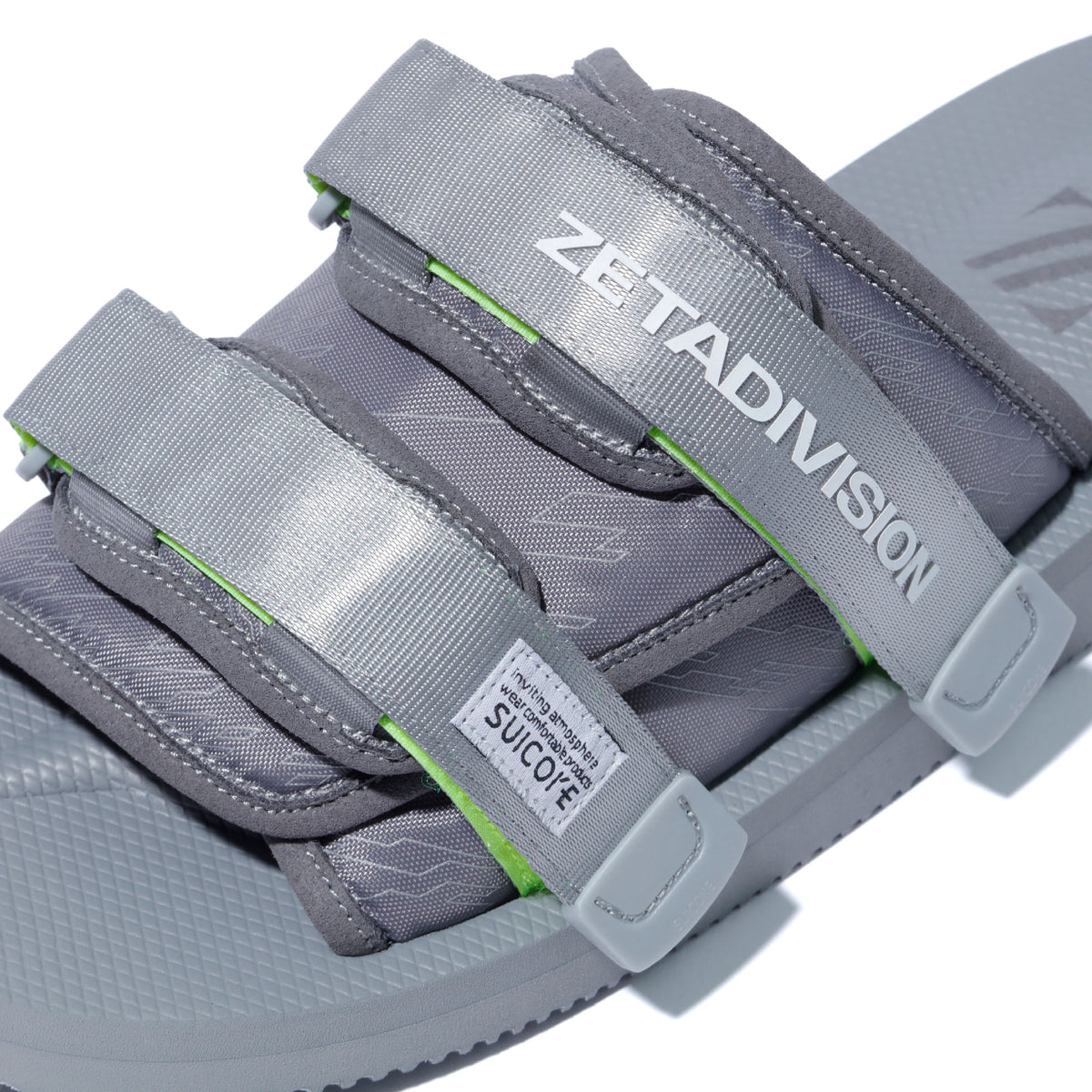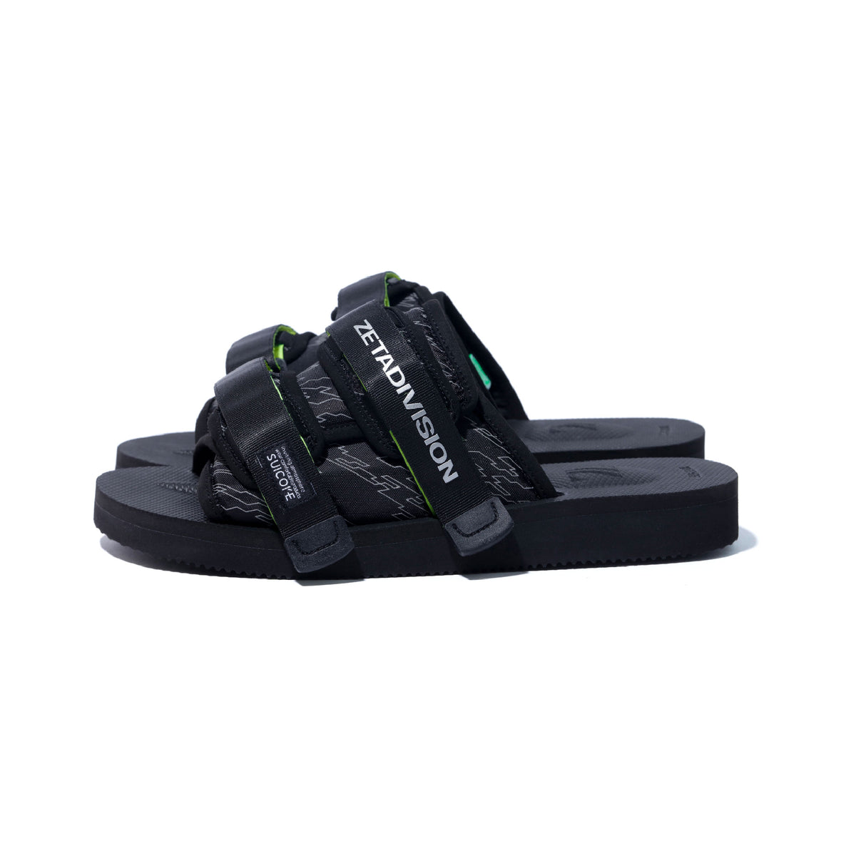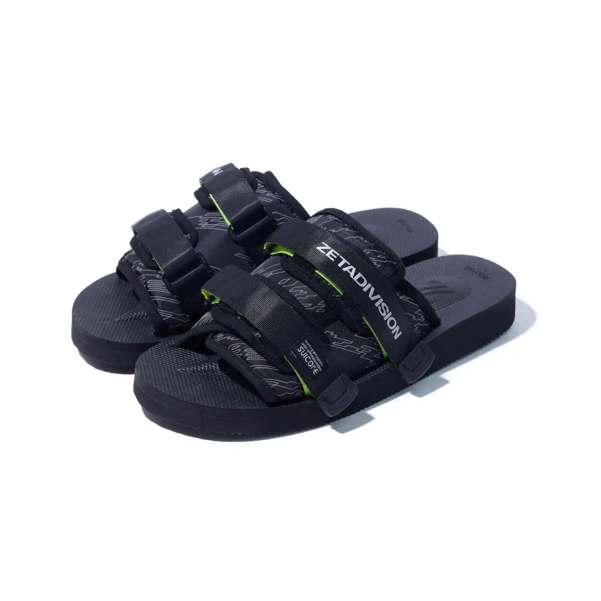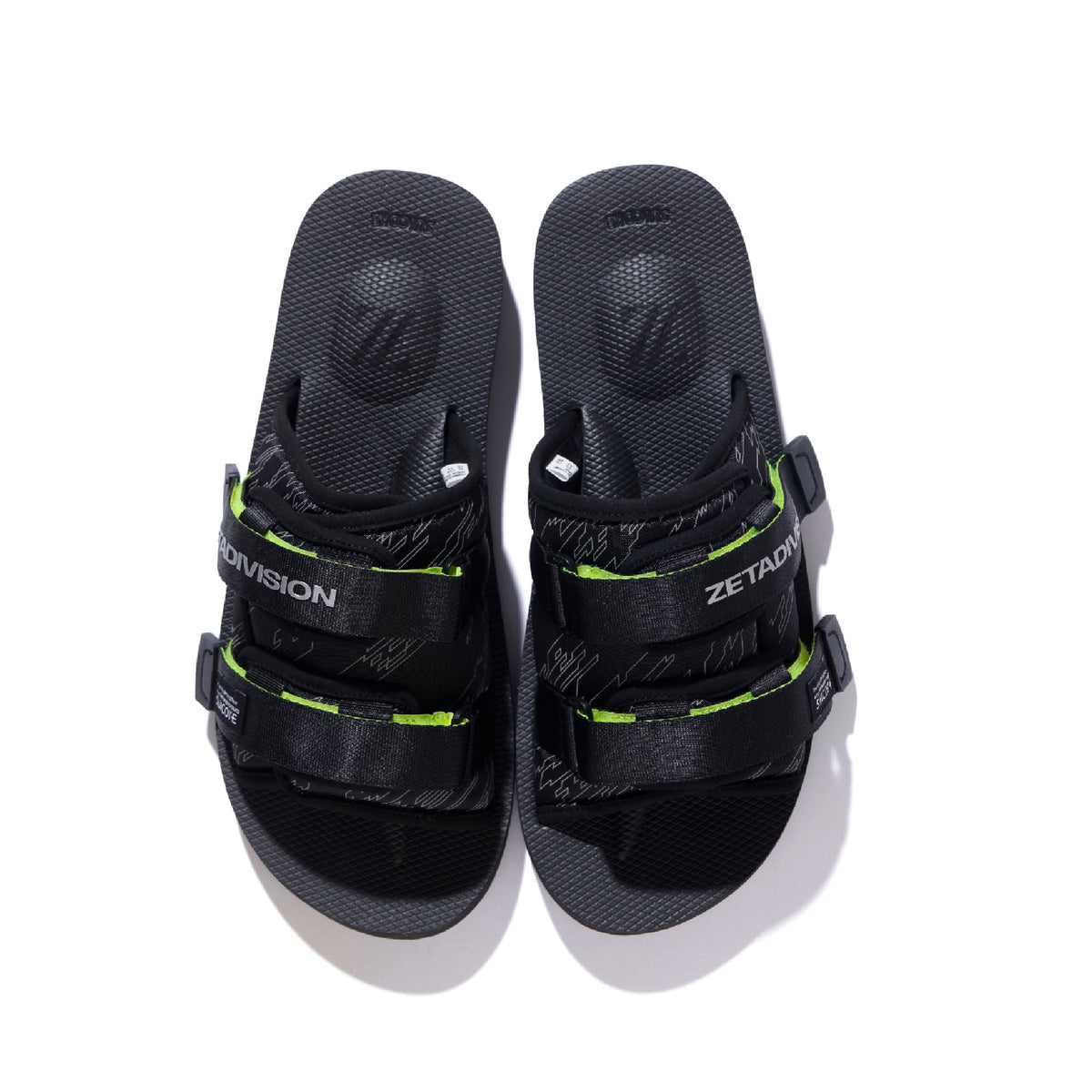The collection centers around the iconic SUICOKE "MOTO" sandal and showcases a camo pattern design with vibrant neon yellow, which represent the unique color palette of ZETA DIVISION. The sandals will be available in two color variations: black and grey.
